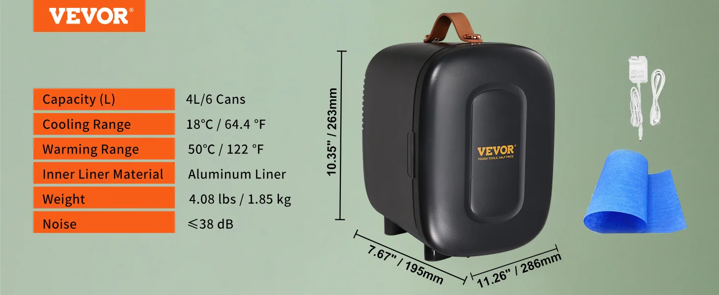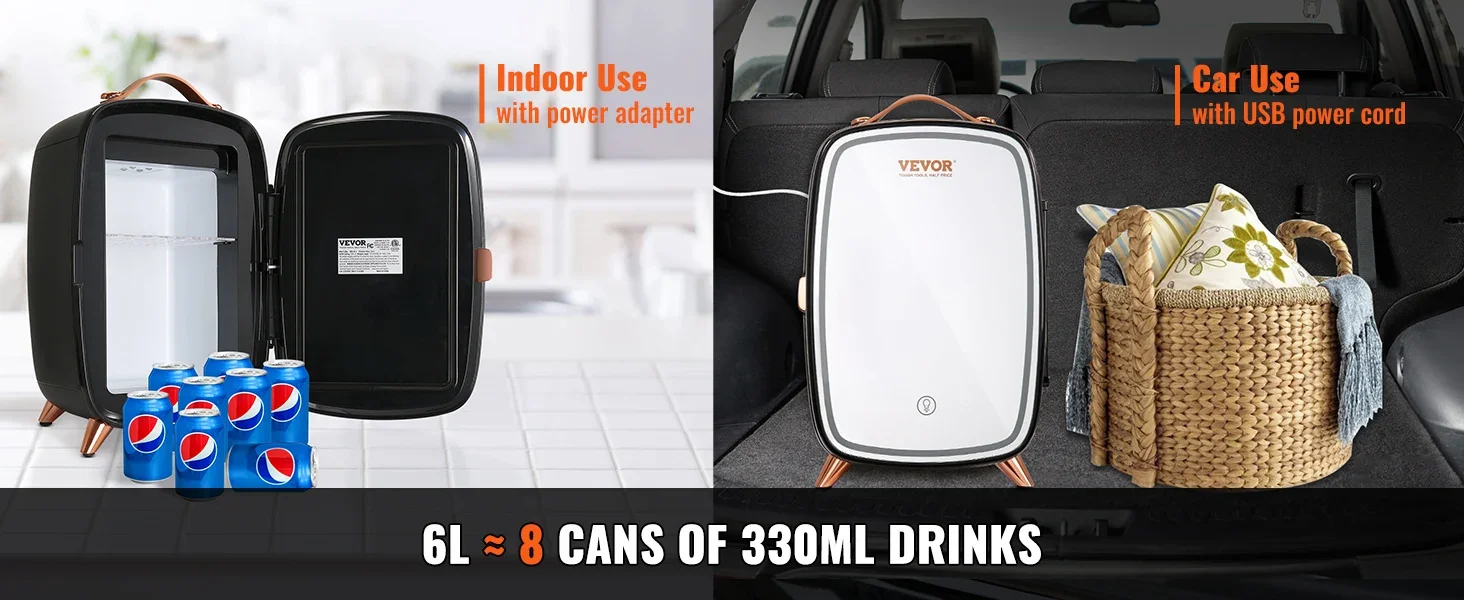 Compact but Spacious: Our mini-fridge features a small body, but it can hold up to eight 330ml cans in its 6L capacity, weighing only 4.08lbs. Its soft PU handle makes it portable and easy to carry, ideal for storing food, drinks, breast milk, skincare products, medicine, and more.