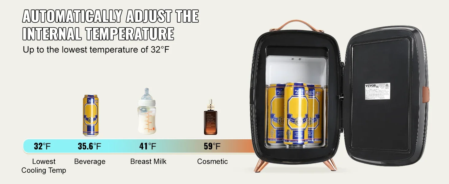 Intelligent Temp Adjustment: Our mini fridge allows automatically adjust the internal temperature of the refrigerator. The cooling mode can reach below 59 ℉ ambient temperature. It only takes two hours to achieve the corresponding cooling effect, and you can use it to store food, drinks, breast milk, skin care products, medicine for preservation.